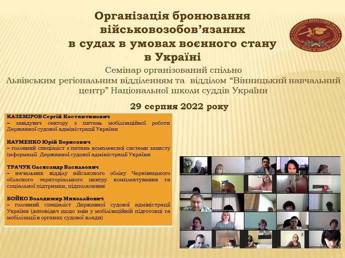 Начальник відділу управління персоналом Волинського окружного адміністративного суду Федосюк Наталія Євгенівна 29 серпня 2022 року взяла участь у семінарі на тему: «Організація бронювання військовозобов’язаних в судах в умовах воєнного стану в Україні».
